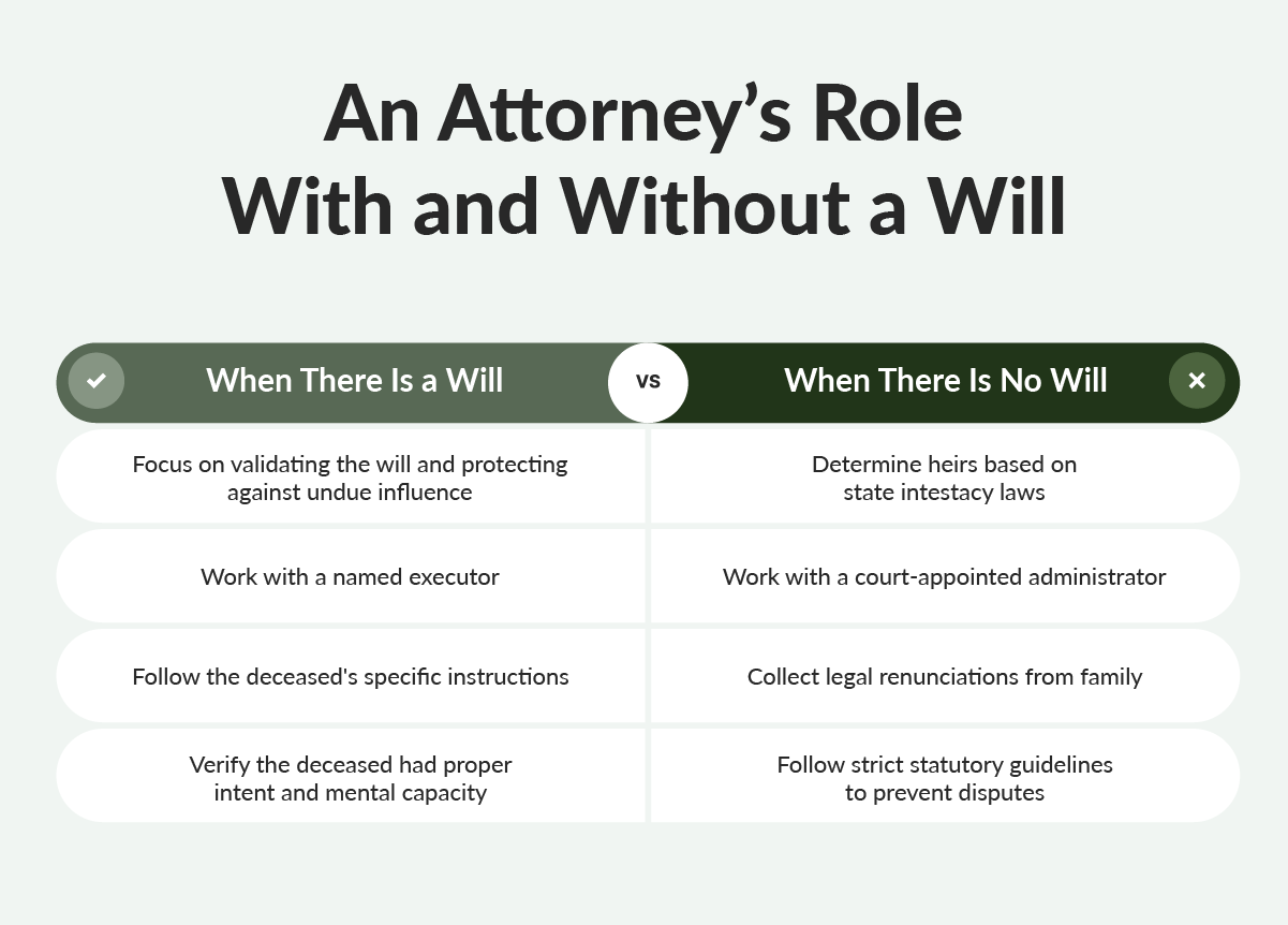 A probate attorney’s duties differ depending on whether the person who has passed away left a will. The best-case scenario is that the deceased individual drafted a valid will before they passed, which means they died testate.